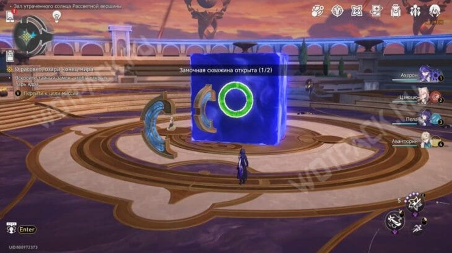 Um in Honkai: Star Rail die zentrale Truhe zu öffnen, müssen Spieler ein spezielles Rätsel überwinden, das sich um ein geheimes Schloss dreht. Dieses Schloss schützt die begehrte Kerntruhe, die im Rahmen der Mission „O Morgenröte, erleuchte das Ende der Welt“ benötigt wird. Das Rätsel erfordert den Einsatz eines besonderen Artefakts – des Oronis-Gebets –, um Fragmente in die Vergangenheit zu schicken und die Projektion so zu verändern, dass die Figuren am Rand des Behälters in den korrekten Farben erscheinen.