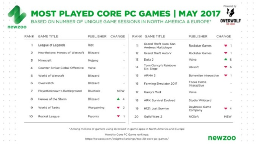 Аналитическая фирма Newzoo представила рейтинг наиболее популярных ПК-игр за май 2017 года. В основу исследования легли данные, собранные с помощью геймерского приложения Overwolf, которое фиксирует активность пользователей из США и Европы. В качестве основного показателя учитывается число уникальных игровых сессий.