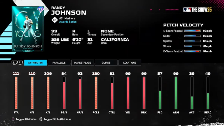 Earlier announcements highlighted that Randy Johnson, a 99-rated player, is featured among this weekend's classic rewards in the awards series. His card embodies the quintessential qualities expected from the legendary pitcher. Notably, his distinctive fastball and sidearm delivery contribute significantly to his effectiveness on the mound. Additionally, his arsenal includes a versatile slider, slurve, and splitter tunnel that often go underappreciated. Even his 2-seamer can be a potent pitch when executed with precision, especially when working off his fastball.