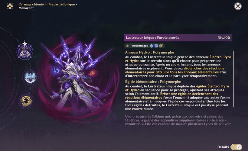 Au début du combat, le lustrateur inique présente une résistance accrue de 200 % face à tous les éléments, ce qui complique la tâche. Il crée simultanément trois anneaux élémentaires : électro, pyro et hydro, qu'il faut détruire rapidement pour étourdir l'ennemi. Si ces anneaux ne sont pas détruits à temps, ils explosent, causant d'importants dégâts à l'équipe. Après l'explosion, ses résistances reviennent à la normale.