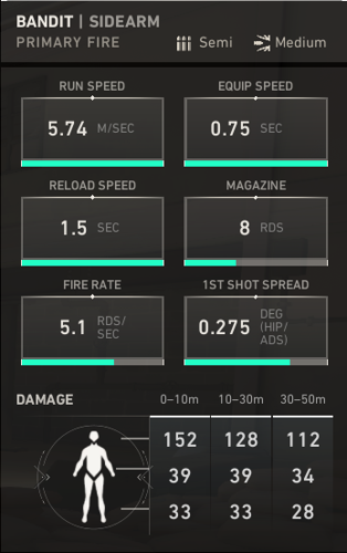 En ce qui concerne le tir, le bandit se positionne stratégiquement entre le fantôme et le shérif. Sa précision lors du premier tir et la cadence de ses tirs rapides en font une arme performante, bien adaptée pour des combats rapprochés ou à moyenne distance. Toutefois, il possède une faiblesse : sa pénétration à travers les murs est modérée, ce qui limite son efficacité pour les wallbangs, une tactique prisée pour surprendre les adversaires derrière les murs.