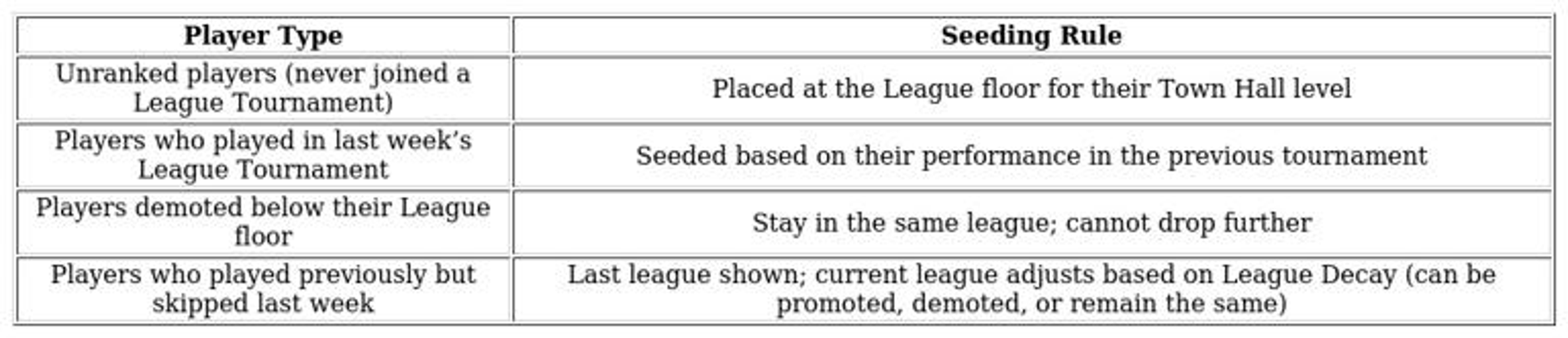 A new feature is the league floor concept tied to Town Hall levels. Each Town Hall has a minimum league that players cannot drop below, ensuring progression remains structured. When players upgrade their Town Hall, they are automatically placed at the corresponding league floor in the next tournament, regardless of previous performance or activity. Only the promoted player receives a notification; others remain unaware of the promotion.